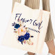 Blue Blush Pink Floral Cute Flowergirl Wedding Tote Bag. Reusable Budget tote bag . Stylish Simple bag for the flower girl. Customise it by changing the name of the flower girl. The design has bright blue and blush pink flowers with flowergirl written in a pretty script font with the name of the flower girl .