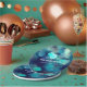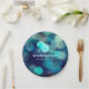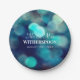 Blue bokeh light effect paper wedding party plates. Custom photo design for wedding party, bridal shower, engagement, anniversary, bachelorette party and more. Personalised Mr and Mrs name initial for bride and groom or newly weds couple. Elegant typography template. Disposable plates with date. Perfect for indoor and outdoor venues.