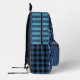Blue backpack perfect for your dog's treats and toys and blankets with a blue and black pattern of bones and balls and paw prints with stripes and a blue buffalo check, personalised with your dog's name beneath a paw print. Blue paw print backpack personalised with name in a white script with a mix of patterns like stripes, blue buffalo check, and bones and balls and paw prints.