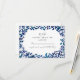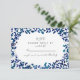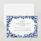 An elegant wedding r.s.v.p. invitation featuring an illustration of blue leaves around edge. Background is white.