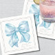 A charming cocktail napkin design featuring a large watercolor blue bow in the centre. The mum to be's name is displayed in a classic serif font, with "Baby Shower" elegantly written below in handwritten script calligraphy. Around the edges of the napkin is a subtle double line frame in soft grey, adding a touch of sophistication and balance to the design.