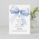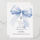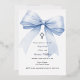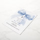 A white background, decorated with a blue large bow and a golden cross. Personalise and add the name and details details.