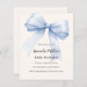 A soft beige, cream coloured background, decorated with a large light blue bow. Personalise and add a name and party details.