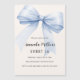 A soft beige, cream coloured background, decorated with a large light blue bow. Personalise and add a name and party details.