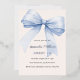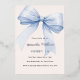 A soft beige, cream coloured background, decorated with a large light blue bow. Personalise and add a name and party details. The name and event are written with real silver foil.