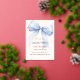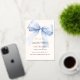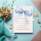 A soft beige, cream coloured background, decorated with a large light blue bow. Personalise and add a name and party details. The name and age are written with real silver foil.