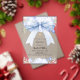 A clear, transparent background, decorated with a light blue large bow, a golden cross and blue florals, flowers. Personalise and add the name and details details.
