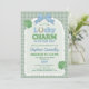 Invite your friends and family to shower the mom to be of a little lucky charm! With a blue bow at the top of an arch-shaped background, a lucky horseshoe in the word Lucky, and two four leaf clovers for extra good luck. The details are drawn digitally by hand. The background is a cottagecore cute gingham pattern in sage green.