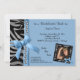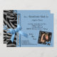 Blue ribbon and silver pearls with black and silver zebra stripes decorate this contemporary party invitation. Upload your own photo to the funky zebra frame to further personalise the look. There is plenty of customisable text on this trendy invitation to add your party information. We also have this design in various colours. Coordinating colours on the back of this plush invitation complete the look and makes this premium design perfect for almost any occasion.