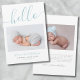 Introducing a simple and minimalist birth announcement, perfect for welcoming your new baby boy. At the top, a warm "hello" in elegant blue script typography sets a soft and inviting tone. The design features spaces for newborn photos on both the front and back, allowing the focus to remain on your precious little one. You can include details such as the baby's name, date and time of birth, and weight—or customise these details as needed. The back offers space for a personal thank you note or additional information about your baby or pregnancy. This announcement is available as a print card or digital download, making it easy to share your joy with loved ones by mail or electronically. The fonts are a mix of blue and grey script and serif styles, but you can change the colours to suit your preferences. Minimalist Baby Boy Photo Birth Announcement Card For Newborn New Baby Blue Hello Script Elegant.