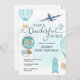 Onederful World Travel boy's 1st first Birthday features aeroplane, passport, hot air balloon, blue luggage, globe, camera and script heart calligraphy type.