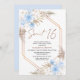 Bohemian inspired sweet 16 birthday invitation featuring two blue and white colored floral arrangements with pampas grass and a modern calligraphy image as a heading in a faux rose gold texture. Ideal for anyone looking for a bohemian inspired sweet sixteen birthday invitation in blue and brown.