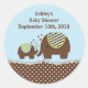 Cute elephant & baby elephant baby shower sticker featuring a sweet little baby & mama elephant set on a blue background with a brown polka dotted accent. Perfect sticker for baby favours or invitation envelope seals & birth announcements! Matching invitations, birth announcements, postage stamps & thank you notes are available in our shop at www.celebrateitinvites.com. ©Chi Chi Memories