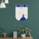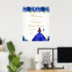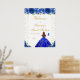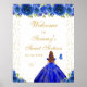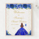 This elegant and glamourous sweet sixteen welcome sign features a beautiful princess with brown red hair and fair skin in a royal blue ball gown. The text combines handwritten script and modern sans serif fonts for a classy and sophisticated look. The floral arrangements, butterflies and gold confetti create the perfect blend of rustic and chic.