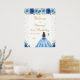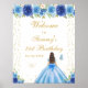 This elegant and glamourous birthday party welcome sign features a beautiful princess with brunette hair and fair skin in a blue ball gown. The text combines handwritten script and modern sans serif fonts for a classy and sophisticated look. The floral arrangements, butterflies and gold confetti create the perfect blend of rustic and chic.
