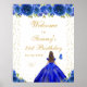 This elegant and glamourous birthday party welcome sign features a beautiful princess with brunette hair and fair skin in a royal blue ball gown. The text combines handwritten script and modern sans serif fonts for a classy and sophisticated look. The floral arrangements, butterflies and gold confetti create the perfect blend of rustic and chic.
