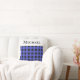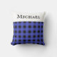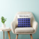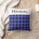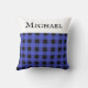 A stylish pillow for a bed, chair or sofa, patterned with a buffalo plaid design in blue and black. At the top is a white band, with your chosen name in black capital lettering. The buffalo check cushion makes an elegant custom gift for friends, family and colleagues, at Christmas and all year round.