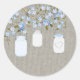 Burlap and mason jar stickers with blue mason jars hanging from a pretty blue cherry blossom tree branch on a rustic burlap background. These burlap and mason jar stickers can be personalised with text for your wedding, baby shower, party or event.