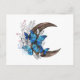 Blue morpho butterflies with detailed wings sit on wooden crescent decorated with wild plants on white background. Blue butterflies morpho.