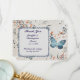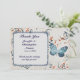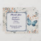 Blue Butterfly & Leaf Swirls Thank You Flat Card. The front has a decorative frame where the information goes. The leaves are orange and dark blue. Trendy with the Pantone wedding colours for 2017. Colours include shades of flame and lapis blue. The background is grey with a spongy texture.