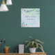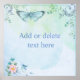 A single blue butterfly on a pale pasta blue and green watercolor background with a floral fringe with a single pink flower; with or without text of your choice.
