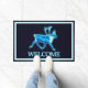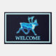 A glowing blue bull caribou, or reindeer along with text reading reading, "WELCOME" in glowing blue and white. Everything is superimposed on a starry background.