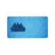 A castle in dark blue and black on a blue pattern background. A this spooky fairytale style castle has the look of a historic house or palace.