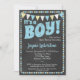 A funky chalkboard blue and yellow baby shower invitation featuring a chunky text "It's A Boy!" at the top with chalkboard background, flags and a cute polka-dot border.