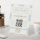 This light blue bakery QR code table sign is perfect for cafes, bakeries. patisseries. This 'Order Here' scannable bakery sign features a blue and cream checkered pattern with gold text featuring your company social media and website details. If you're bringing your own logo you can edit the croissant logo to your own logo in seconds and update all text before placing your order.
