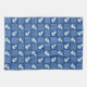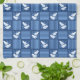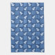 Wintry kitchen towel with a blue chequerboard design of turtles doves, stripes, and snowflakes.