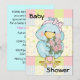 Sweet baby shower invitation done in lovely soft colours and adorable graphics of a little blue chick holding pink roses. Set on a pastel patchwork looking background this cute invitation is perfect for any baby shower. Personalise the text, on the front and back of the invitation to suit your needs.