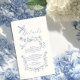 A classic blue and white design inspired by vintage Chinoiserie and toile de Jouy prints. Features hand-drawn botanical wreaths, delicate floral motifs, and soft ink-style detailing. The symmetrical layout and intricate borders evoke timeless elegance with a romantic, heirloom feel — perfect for refined occasions and traditional themes.