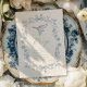 A classic blue and white design inspired by vintage Chinoiserie and toile de Jouy prints. Features hand-drawn botanical wreaths, delicate floral motifs, and soft ink-style detailing. The symmetrical layout and intricate borders evoke timeless elegance with a romantic, heirloom feel — perfect for refined occasions and traditional themes.