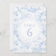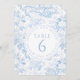 Classic elegant blue chinoiserie porcelain inspired floral pattern spring or summer wedding table numbers with bride and groom names.