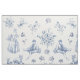 Vintage blue pattern of a French pastoral toile scene with a lady holding a basket, a peasant boy and a group of sheep with floral accents.