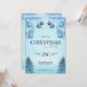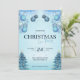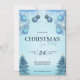 There are blue and white Christmas balls hanging from above, with Christmas trees displayed below.