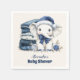 Celebrate a winter baby shower with this adorable design featuring a hand-painted baby elephant in a Santa hat, surrounded by folded blankets and festive blue ornaments. The soft watercolor textures and cool navy tones create a cosy, magical atmosphere—perfect for welcoming a baby boy during the holiday season.