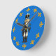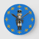 A nutcracker toy soldier dressed in blue stands in the centre of this clock. Twelve gold fleur-de-lis mark each hour. Use the Edit Design button if you would like to change the existing blue background or add some text.