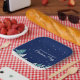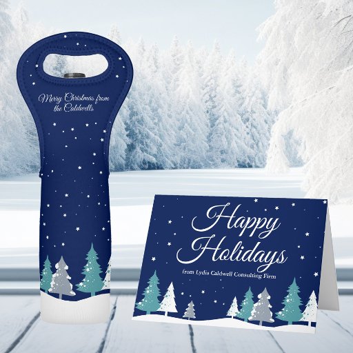 Beautiful midnight blue sky with Christmas fir trees decorate this pretty, custom Christmas party paper plate for desserts. Snow lines the lovely forest and white snowflakes sprinkle down in the night air. Personalise this pretty decor for a holiday gathering.