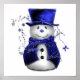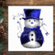 A whimsical, cute snowman dressed in a blue velvet top hat and waistcoat, surrounded by blue stars for Christmas.