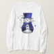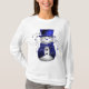 A whimsical, cute snowman dressed in a blue velvet top hat and waistcoat, surrounded by blue stars for Christmas.
