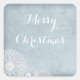 Merry Christmas wish on a soft blue textured background with an elegant detail of white lace circles with pearl centres. Stickers can be used to seal your envelopes or as gift tags. Text can be changed to your liking.