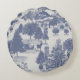 Celebrate Christmas right this year with this gorgeous round pillow featuring a toile design with a beautiful Christmas tree in the foreground being discovered by a curious child. A dancing couple, trees, Santa's sleigh, presents, and a reindeer all grace the mid-ground. And, in the background, there's a cosy winter cabin nestled amongst the hills, surrounded by trees.