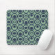 This mouse pad has a geometric design of circles in rows with circles or ovals inside in blue on a field of green.