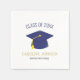 A simple blue cap and tassel graduation party paper napkin. These paper napkins feature a blue cap and the graduates name and high school.