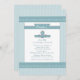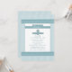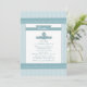 A handsome light blue and white invitation with pin-stripes, decorative swirl borders and a communion cup with a cross. (FP)