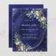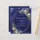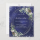 A navy blue, uneven coloured background decorated with cones, white berries and greenry. A faux silver oval frame and glitter. Personalise and add the details.