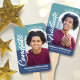 Stay cool while supporting your favourite grad as they receive their diploma, with this keepsake 2 photo hand fan. On the front, bold, graphic, white handwritten “congrats” script calligraphy, white and navy sans serif typography and a photo of your choice in an arch overlay a dusty turquoise and navy blue background. On the back, white handwritten “graduate” script calligraphy and sans serif typography, along with an additional custom photo, overlay turquoise and navy. Personalise the custom text with your grad’s name, school and class year. Matching invites, thank you cards, address labels, stickers and other graduation goodies are also available in this trendy and stylish collection. Guaranteed to preserve cherished memories of their special occasion!