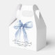 Chic bridal shower favour gift boxes featuring an elegant blue coquette bow watercolor, "with love and thanks" in a modern script, and the name of the bride and the shower date in simple lettering.