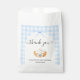Send guests home with a sweet "thank you" using this charming baby shower favor bag, designed to coordinate with my "cutie pie" invitation suite. Featuring a soft blue gingham background with white floral accents, and a charming pumpkin pie graphic topped with whipped cream and a blue bow, this bag adds a heartfelt and stylish touch to your celebration.